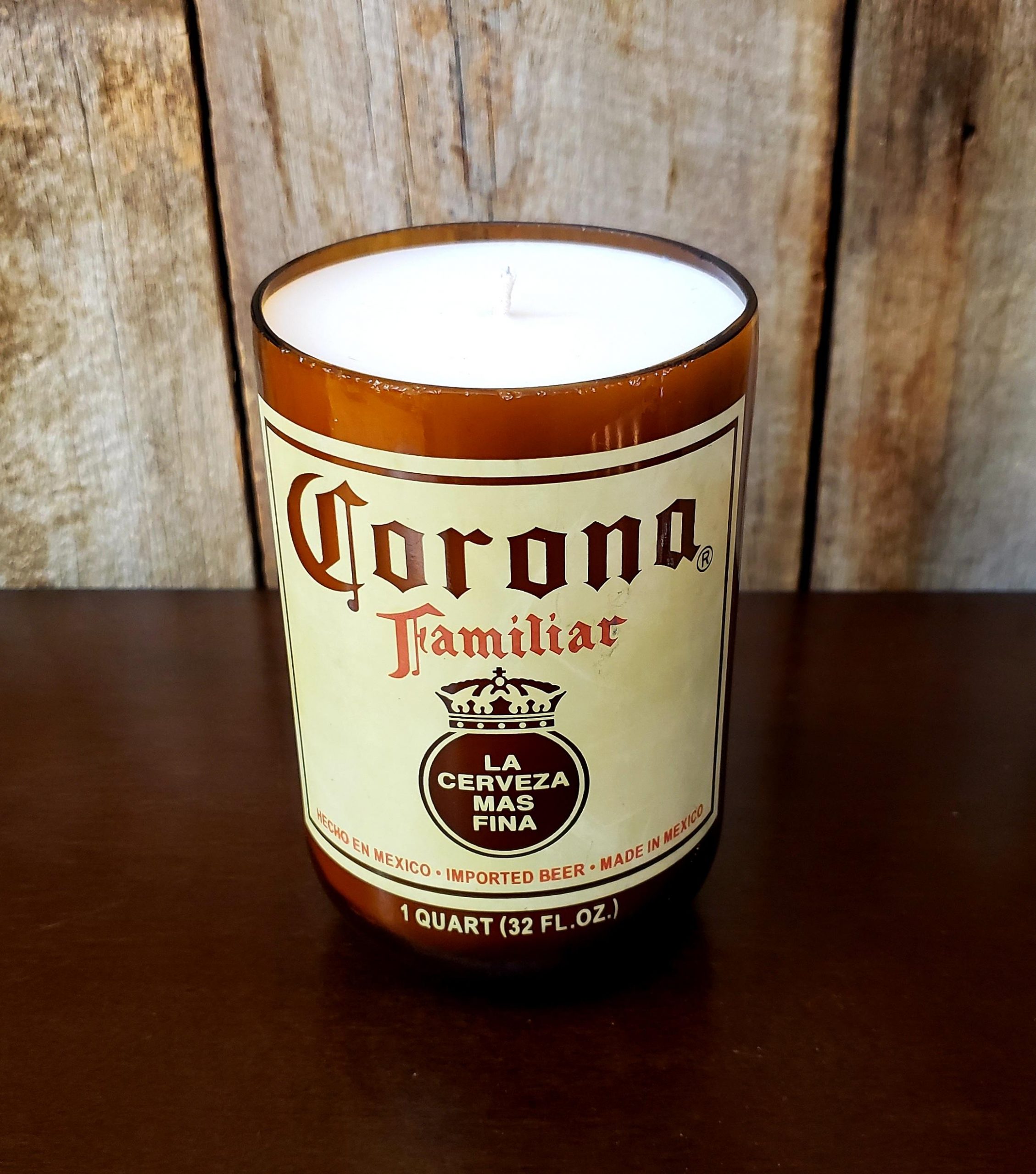 Beer Candle in a cut Cororna Familiar Bottle (lxd 5 1/2in x 3 1/2in).