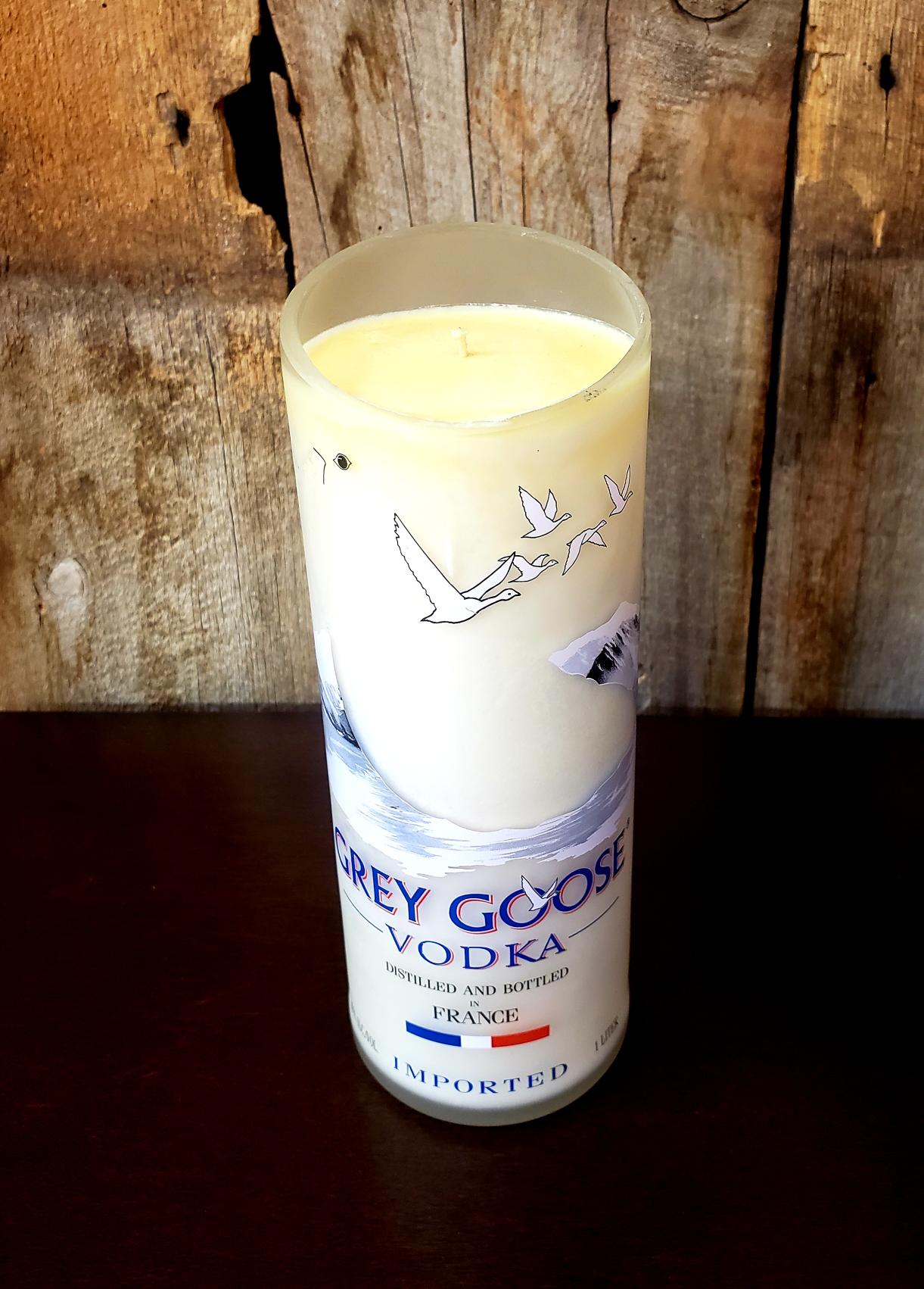 Cozy Cabin Candle in a cut Grey Goose Vodka bottle (lxd 8 1/2in x 3 1/2in).