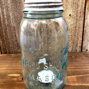 This is a 32oz Antique Blue Lead Glass Mason jar. This container is perfect for the Farm House Shabby Chic Style.Dimensions (lxd) 7in x 4in.