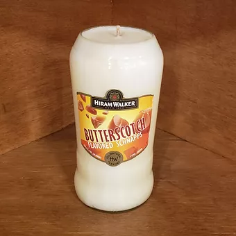 ?Butterscotch Brulee Candle in a cut Butterscotch Schnapps bottle (lxd 7 1/4in x 3 1/2in).