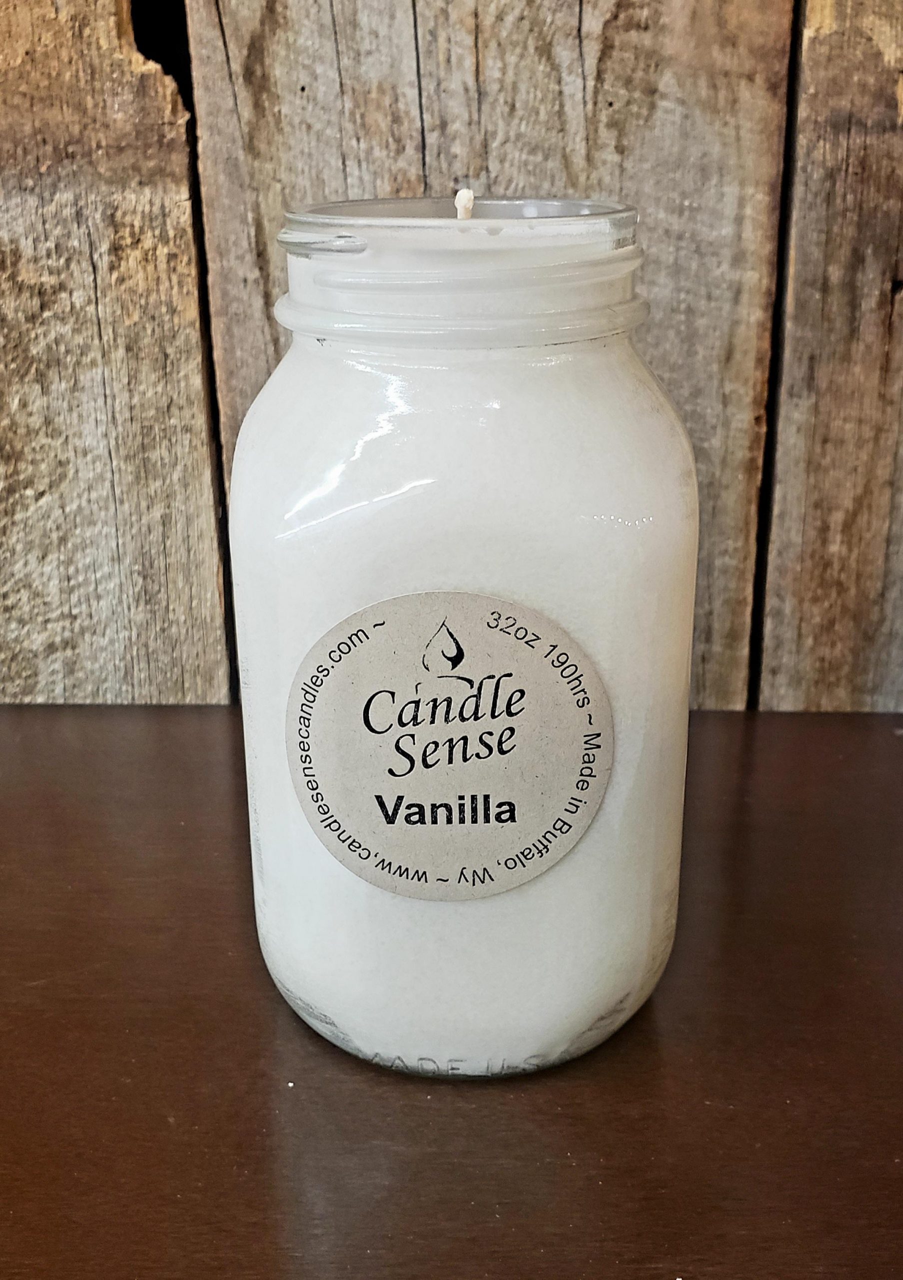 32oz Soy Wax Candle with Vanilla Fragrance in Mason Jar (lxd 7in x 3 1/2in).