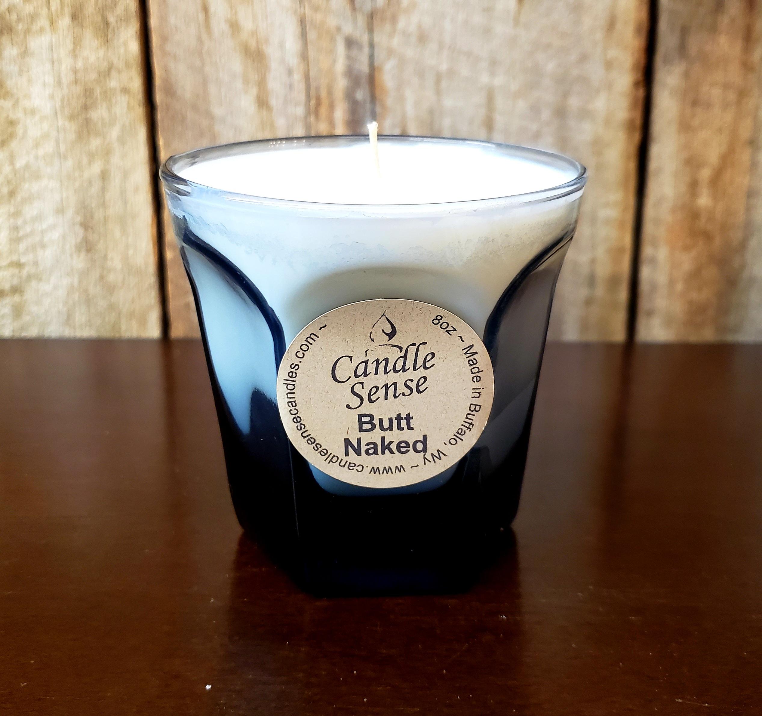 Butt Naked Candle in a Blue Glass (lxd 3 1/2in x 3 1/2in).
